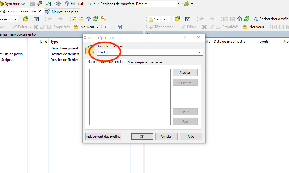 - Une fois connecté, vous devez sélectionner votre bucket, cliquer sur Open directory/Bookmark (Ouvrir répertoire/Signet) ou appuyer sur Ctrl + O