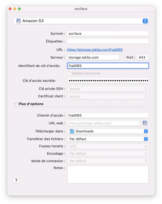 - entrez l’adresse du serveur : storage.teklia.com