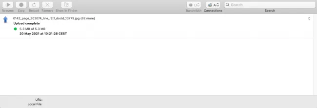 - La fenêtre de gauche représente vos documents sur votre ordinateur, celle de droite représente les fichiers de votre bucket. Vous pouvez télécharger en sélectionnant des documents et en cliquant sur (Upload) Télécharger ou avec un glisser-déposer.